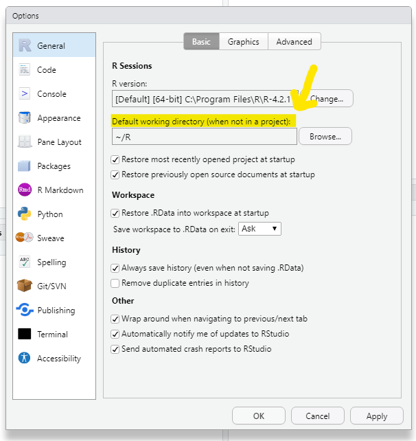 [Tools] → [Global Options] → [General] → Default working directory → 원하는 디렉토리 입력